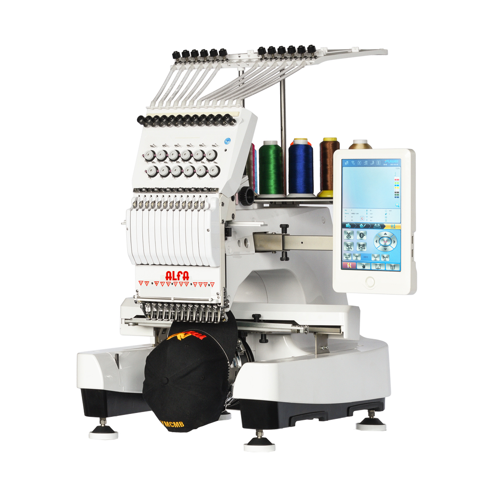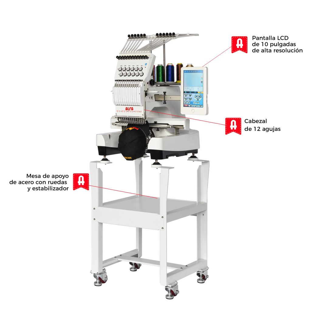 La bordadora industrial Alfa AX12 es una máquina de coser de 12 agujas diseñada para bordados en plano (camisetas, sábanas, etc.) y gorras. Su área máxima de bordado de 360 x 200 mm permite realizar trabajos detallados y de gran tamaño.